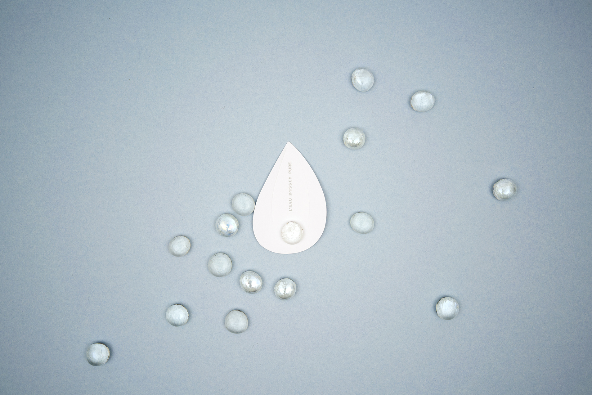 La touche à sentir l’Eau d’Issey Pure vient de la demande du client de faire vivre une goutte sur une touche et d’écrire une histoire en plusieurs actes sur la vie d’un pétale. Nous avons conçu cette carte à parfum l’Eau d’Issey Pure avec sa bille de verre collée à la main.